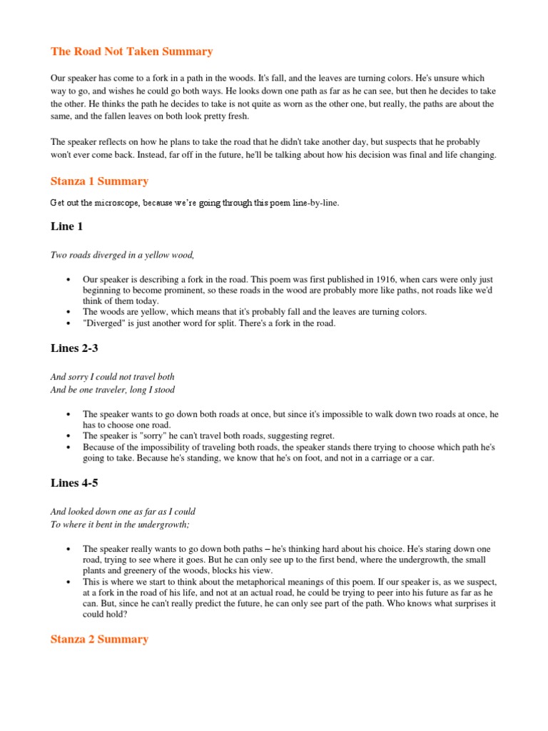 It was published in the atlantic monthly in august 1915. The road not taken summary. All the exercises and question and answers are given at the back of the lesson. The four stanza poem has inspired and stirred many minds in the world. As the poet who took the road not taken by many people, write a letter to your friend stating how it has made all the difference. Both the roads were looking same on that day because no one had. The road not taken published in the year 1916 is one of his finest accomplishments as a poet. Some decisions are simple to make whereas others are inherently. Here we have given the road not taken summary in hindi and english. Summary of the road not taken. Our notes cover the road not taken summary and detailed analysis. The fork offers the speaker a choice of roads, and the reader quickly comes to understand that these roads symbolize choice in. Savesave the road not taken summary for later.
